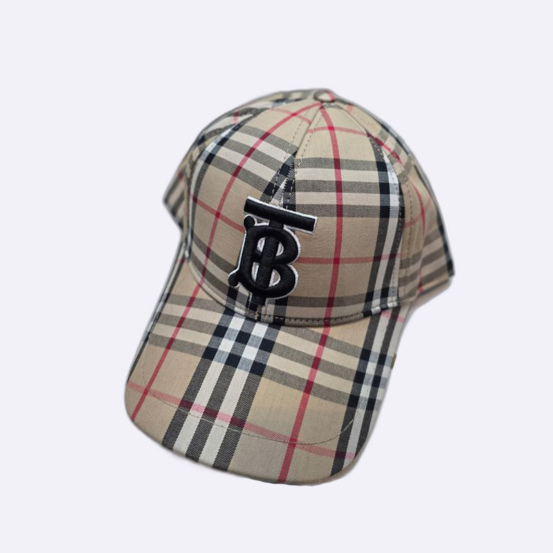 قبعة رجالية فاخرة تتميز بنقشة مربعات بربري التقليدية مع حروف اسم العلامة التجارية مطرزة باللون الذهبي البارز وحافة أمامية بلون بيج.