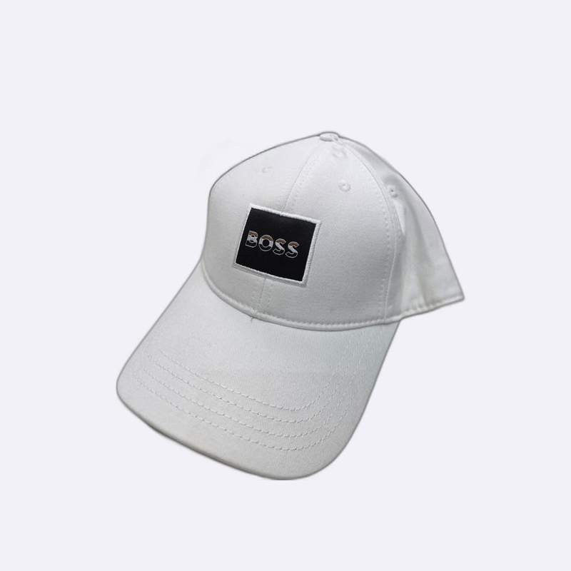 قبعة رجالية بيضاء كلاسيكية تتميز برقعة مربعة سوداء في المقدمة تحمل اسم العلامة التجارية BOSS بتصميم عصري.