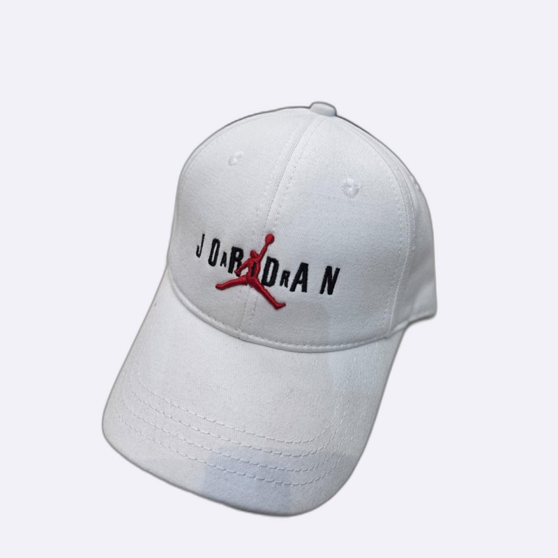 قبعة رجالية بيضاء تتميز بتصميم عصري يجمع بين شعار جامب مان باللون الأحمر وتطريز كلمة JORDAN باللون الأسود في المقدمة.