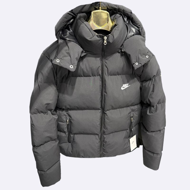 سترة شتوية رجالية منفوخة باللون الأسود، تتميز بتصميم مبطن لتوفير الدفء مع قلنسوة قابلة للتعديل وشعار نايكي الصغير باللون الأبيض على الصدر.