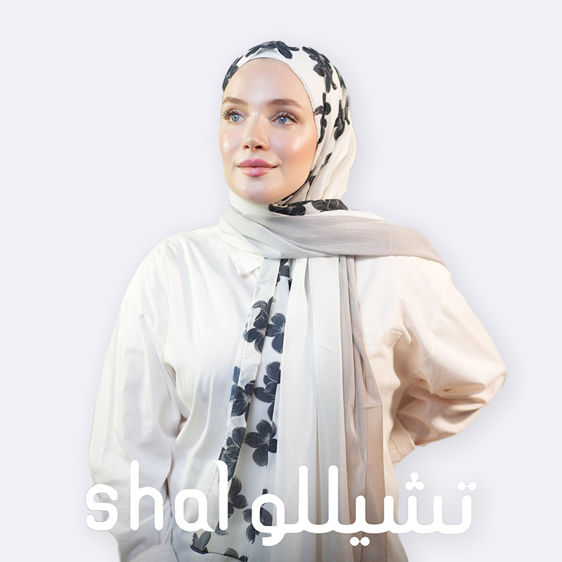 حجاب أنيق مزين بنقوش ورد ناعمة وتصميم عصري مريح.