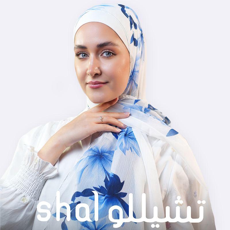شال حجاب أبيض بنقوش زهور زرقاء زاهية تمنحك إطلالة مشرقة وجذابة.