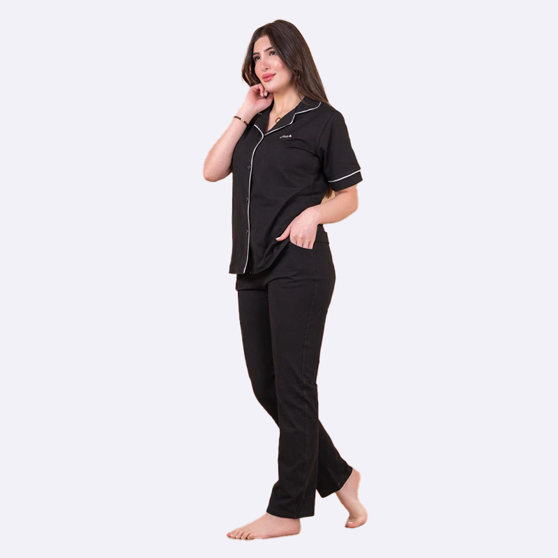 طقم بيجاما مريح بتصميم كلاسيكي، يتميز بقميص بأكمام قصيرة وأزرار وبنطلون طويل، ومزين بتفاصيل حواف متباينة، مثالي للارتداء المنزلي.
