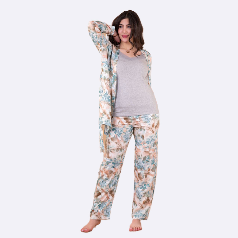 طقم بيجاما مريح من ثلاث قطع، يتكون من قطعة علوية سادة، وبنطلون وروب مفتوح بطبعة زهور، مثالي للاسترخاء والارتداء المنزلي.