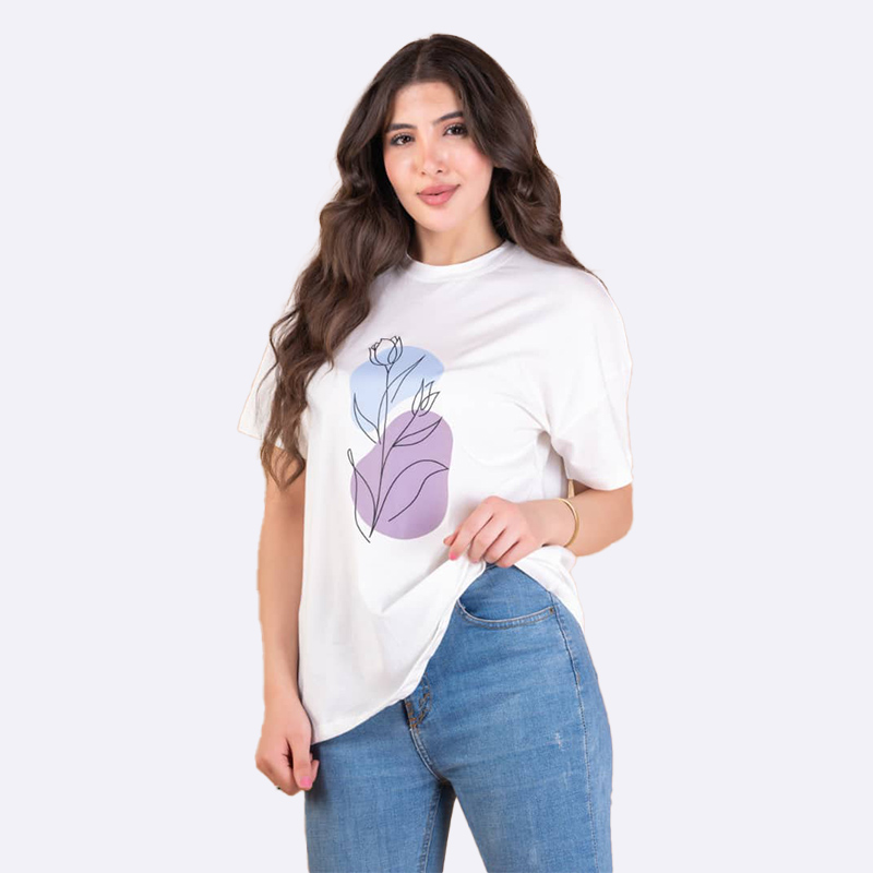 تي شيرت نسائي بأكمام قصيرة وطبعة زهرة مجردة أمامية، بقصة مريحة وعصرية للارتداء اليومي.