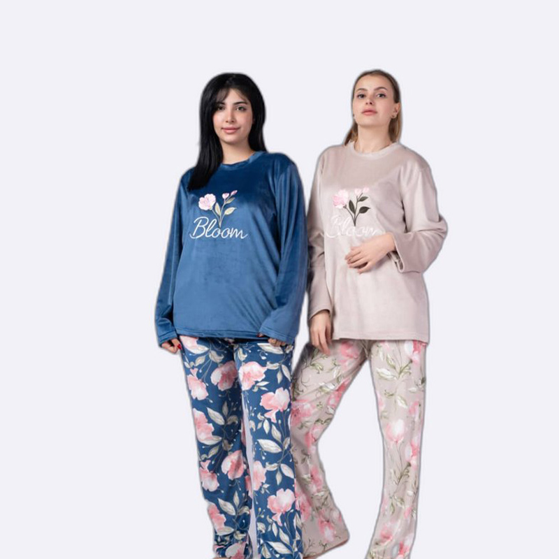 استمتعي بأوقات استرخائك مع هذا الطقم المخملي الأنيق والمزين بالزهور. تصميم مريح وعصري يضفي لمسة من الأناقة على ملابس النوم الخاصة بك.