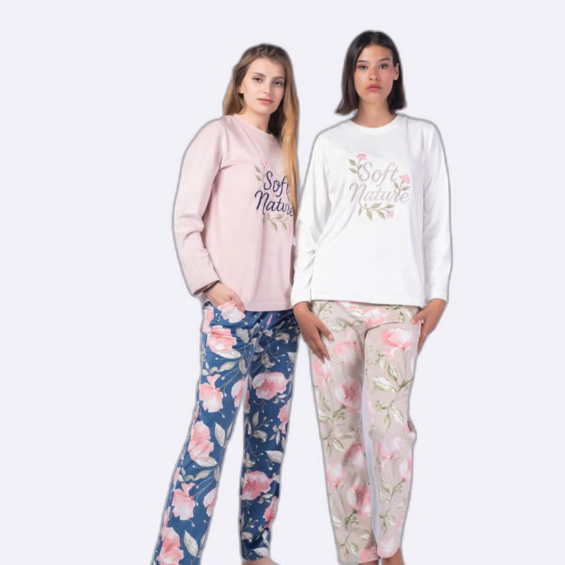 استمتعي بنوم هانئ ومريح مع طقم البيجامة الناعم والمزين بنقشة الزهور. تصميم أنيق ومريح يجعله مثالياً للاسترخاء في المنزل.