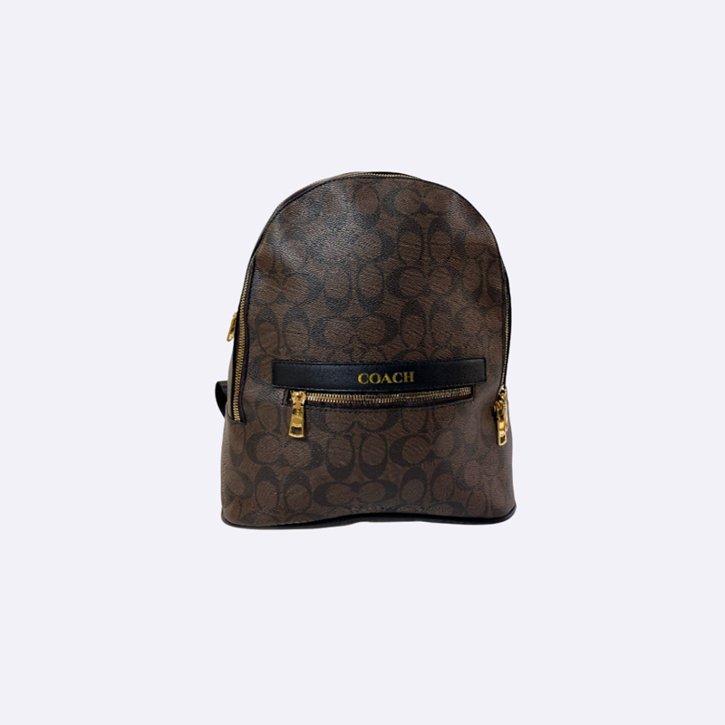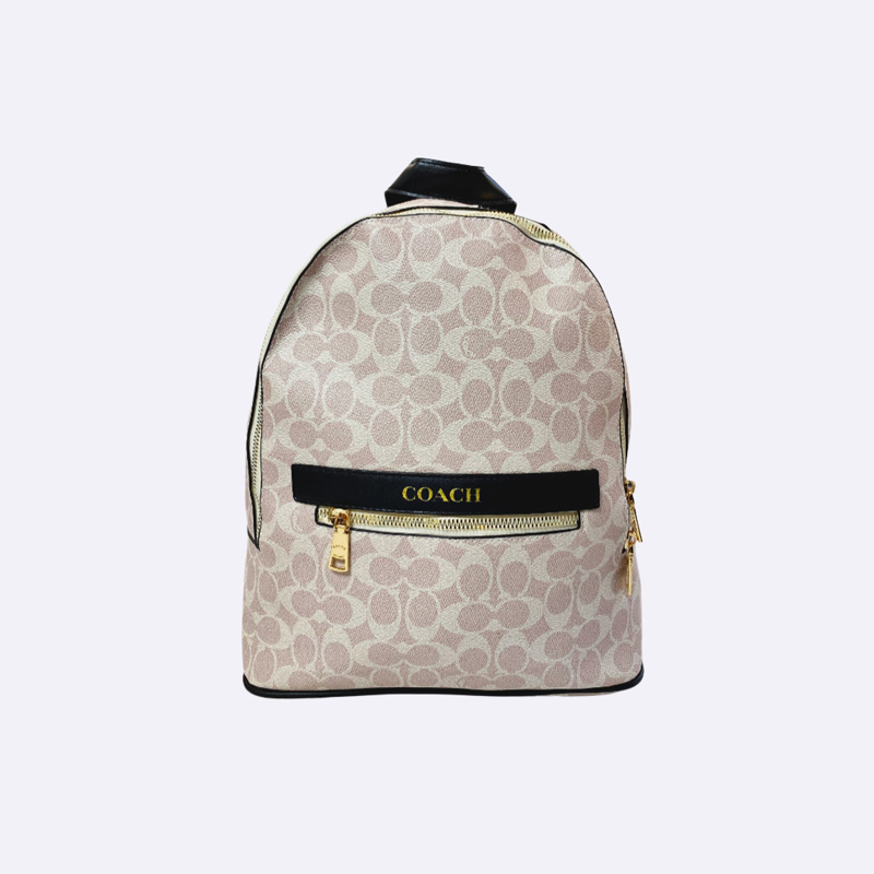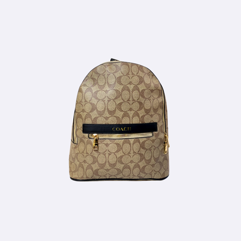 حقيبة ظهر نسائية أنيقة ومميزة، مصنوعة من قماش بطبعة شعار "C" الشهير من "Coach" باللونين البيج والبني. تتميز بتصميم كلاسيكي، مع سحّابات ذهبية اللون وجيب أمامي بسحاب أسود