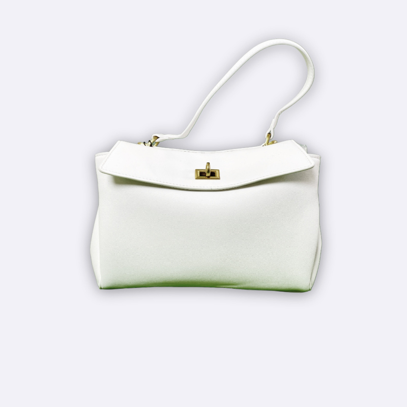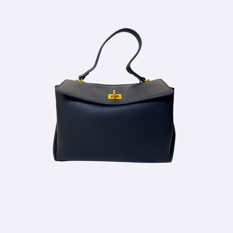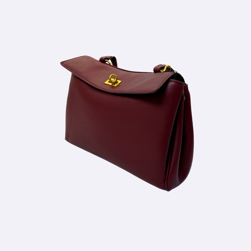 حقيبة يد أنيقة من بالنسياغا باللون العنابي، مصنوعة من الجلد. تتميز بمقبض علوي وقفل أمامي ذهبي، مع حزام كتف إضافي قابل للتعديل