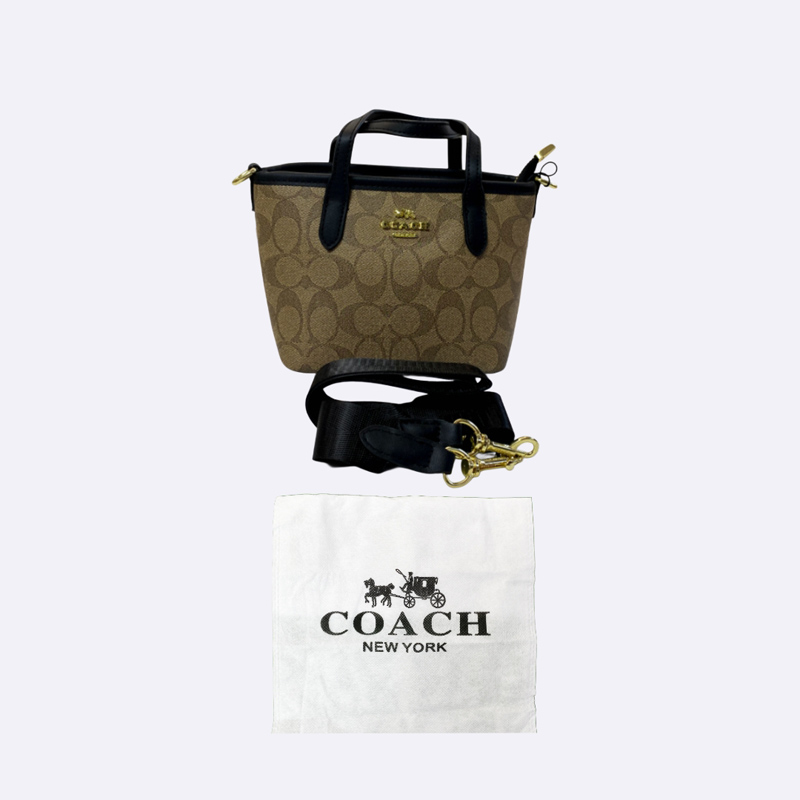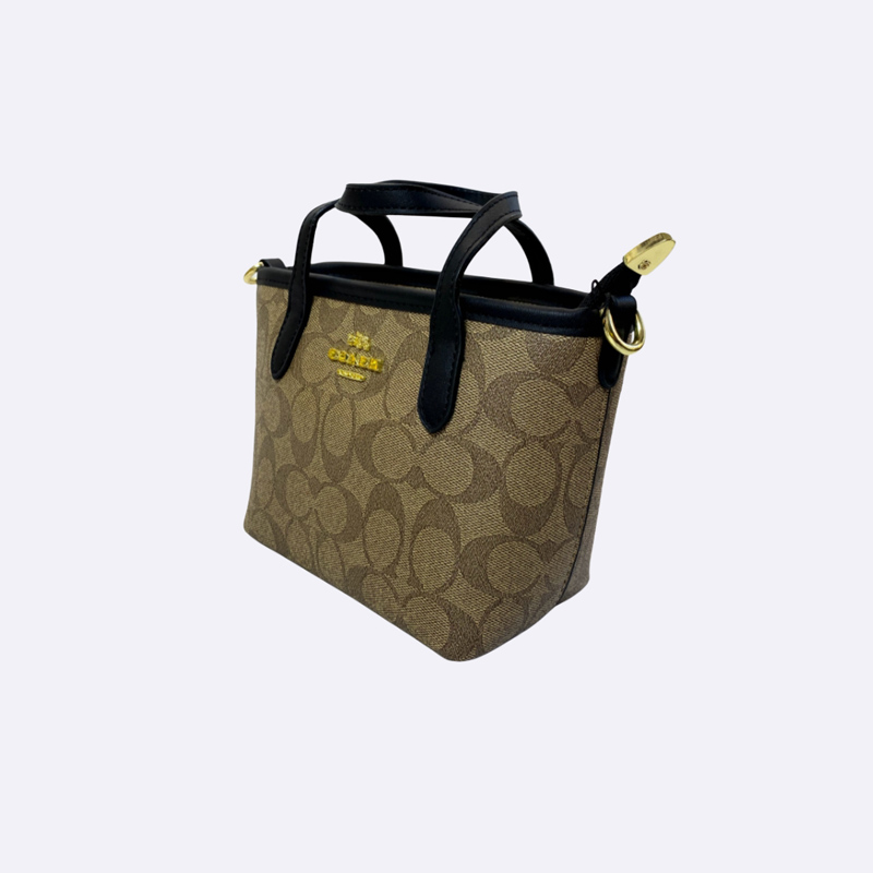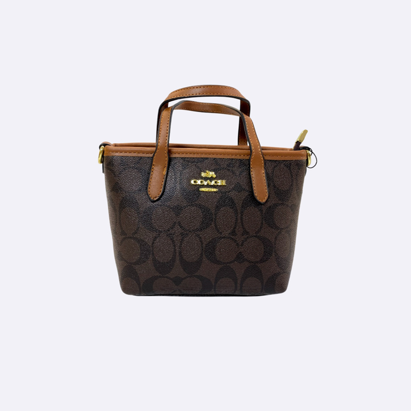 حقيبة يد صغيرة من كوتش بلون بني وطبعة شعار الماركة، تتميز بمقابض علوية وحزام كتف قابل للفصل باللون الأسود.