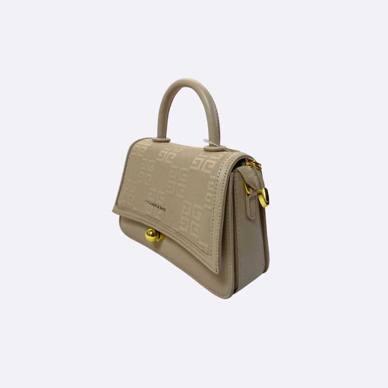 حقيبة يد نسائية أنيقة باللون البيج الفاتح، تتميز بتصميم كلاسيكي وطبعة مونوجرام بارزة. تأتي بمقبض علوي وحزام كتف قابل للتعديل، مع قفل أمامي معدني ذهبي.