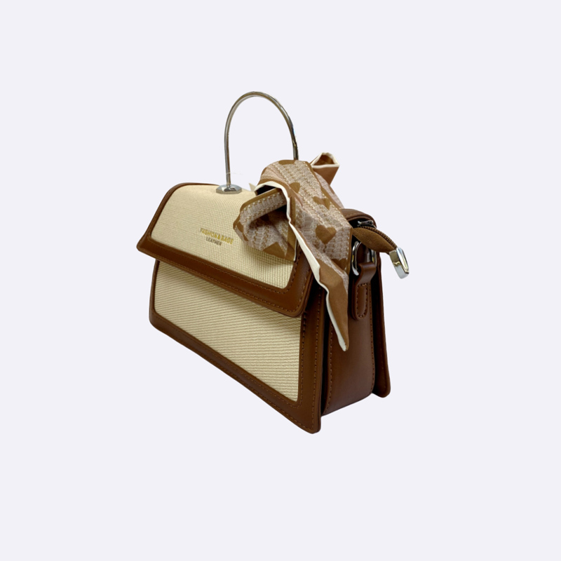 حقيبة يد أنيقة تجمع بين قماش الكانفاس باللون البيج الفاتح والجلد البني. تتميز بمقبض علوي معدني، وشريط مزخرف، وحزام كتف قابل للتعديل.
