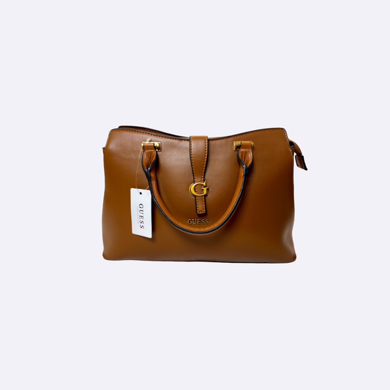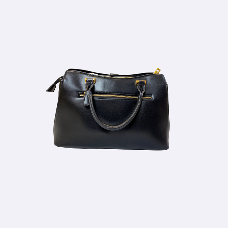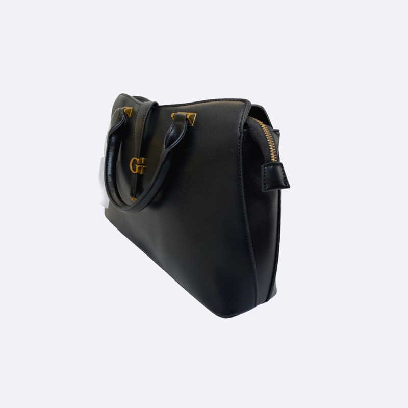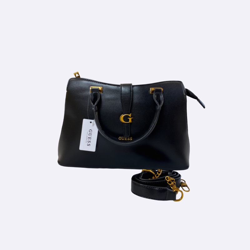حقيبة يد أنيقة من جس باللون الأسود، تتميز بمقبضين علويين وشعار الماركة "G" الذهبي في الأمام. تأتي مع حزام كتف إضافي ومزينة بسلسلة ذهبية