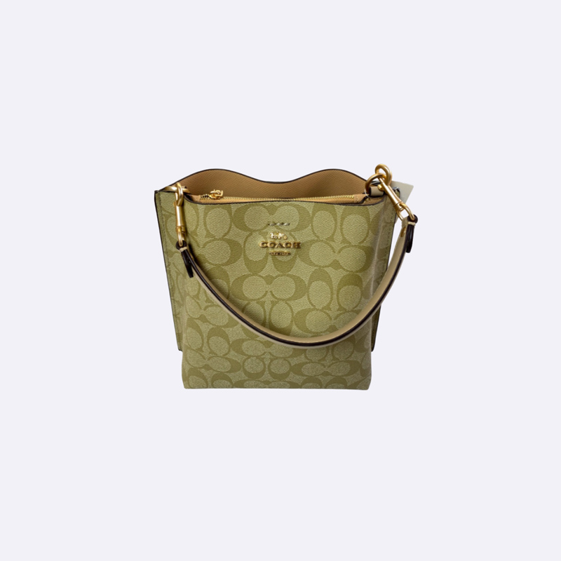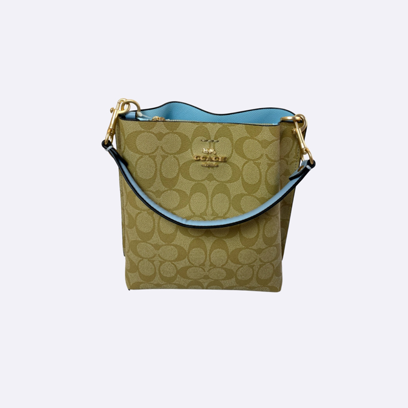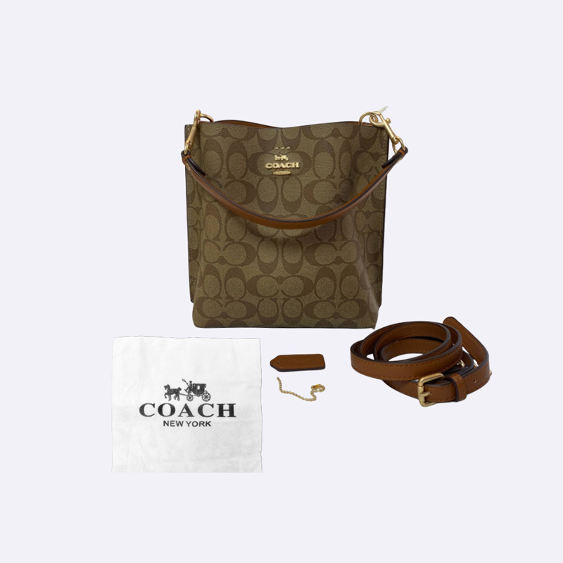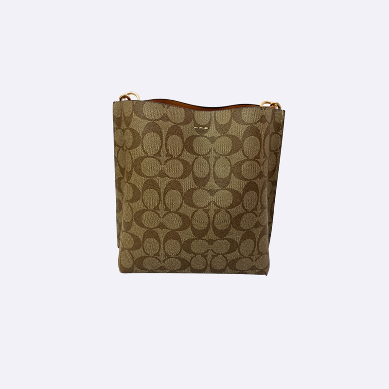 حقيبة يد أنيقة من ماركة كوتش، بتصميم دلو ولون بني فاتح. مزينة بنقش شعار الماركة الشهير ومزودة بحزام كتف.
