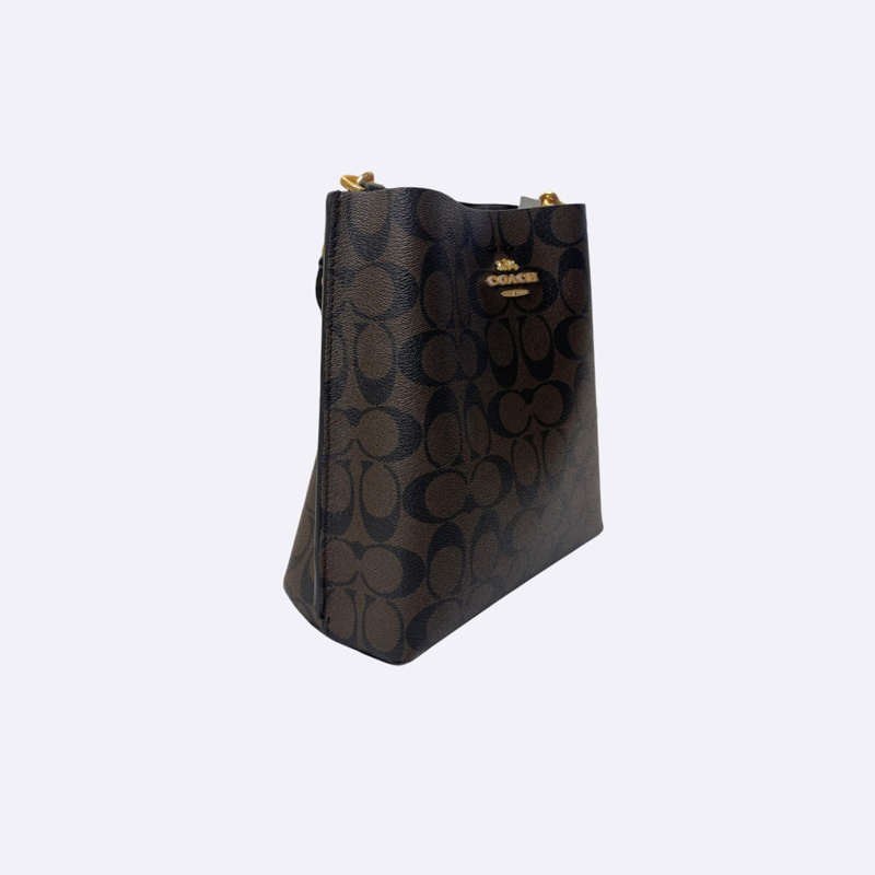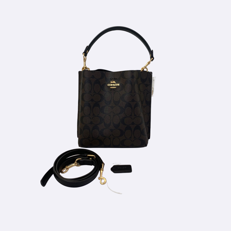 حقيبة يد أنيقة من ماركة كوتش، بتصميم دلو . مزينة بنقش شعار الماركة الشهير ومزودة بحزام كتف.