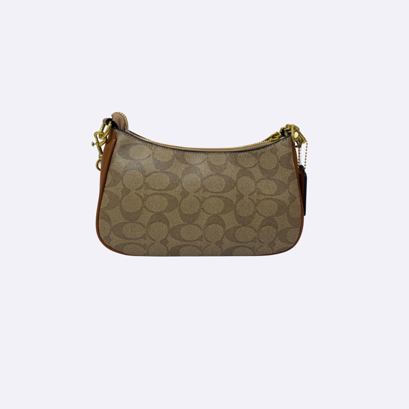 حقيبة كتف صغيرة أنيقة من ماركة "كوتش" بتصميم "سيجنتشر" الكلاسيكي، مزودة بسلسلة ذهبية وحزام جلد قابل للتعديل والفصل، مثالية لحمل الأساسيات اليومية.