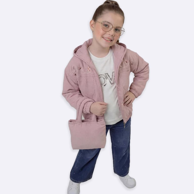 أطلقي العنان لأناقة ابنتك مع هذا الطقم الرائع! جاكيت مخملي مريح ومطرز بشكل جميل مع حقيبة يد صغيرة متناسقة، مثالي لإطلالة عصرية ومميزة.