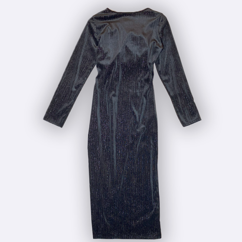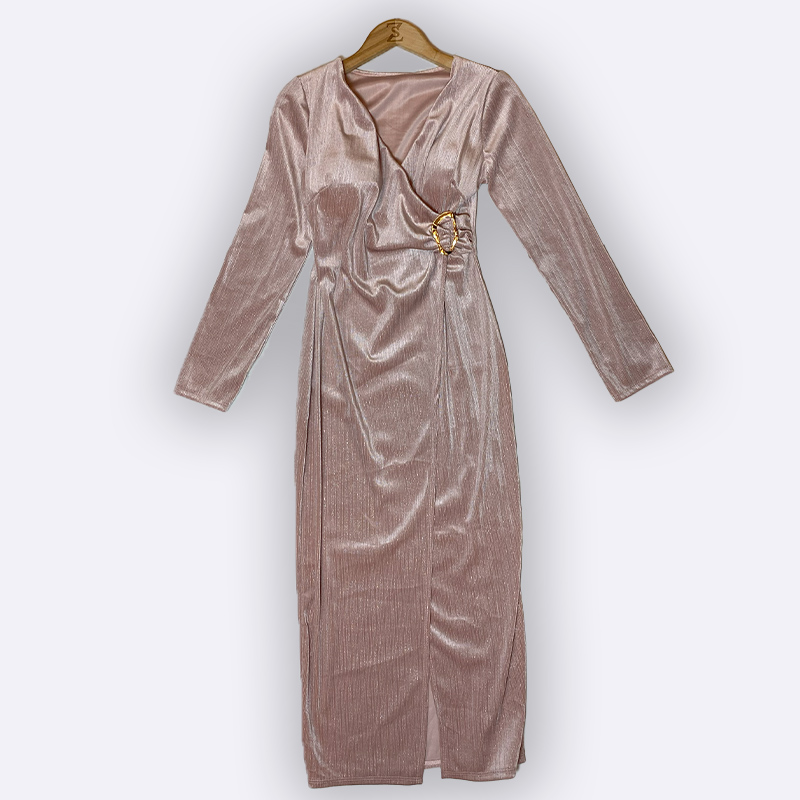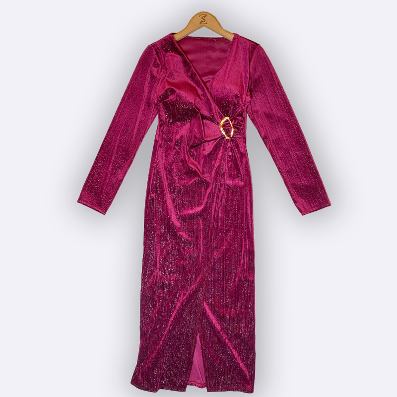 فستان سهرة مخملي لامع بفتحة رقبة على شكل حرف V وتصميم ملفوف (Wrap)، يتميز بشق أمامي ومشبك ديكوري ذهبي عند الخصر.
