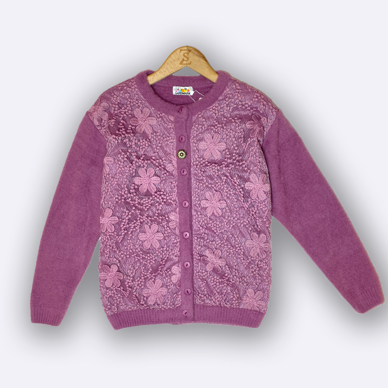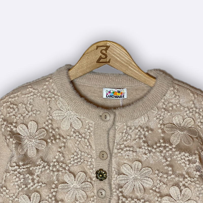 كارديغان صوفي محبوك بأزرار أمامية، يتميز بتغطية من الدانتيل ثلاثي الأبعاد بنقشة أزهار على الصدر، وأكمام سادة. مثالي للارتداء الخفيف والأنيق.