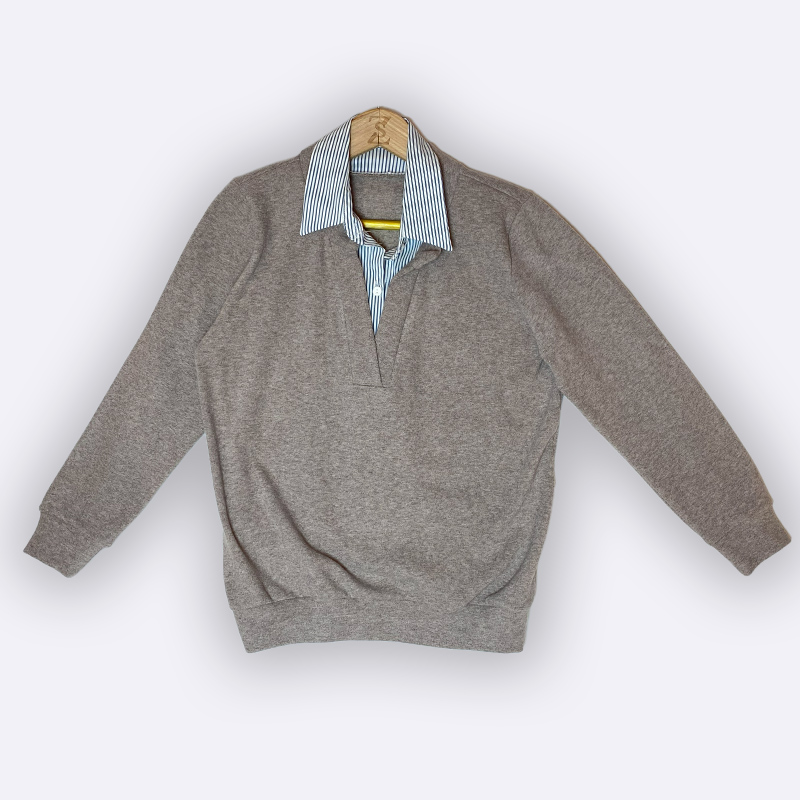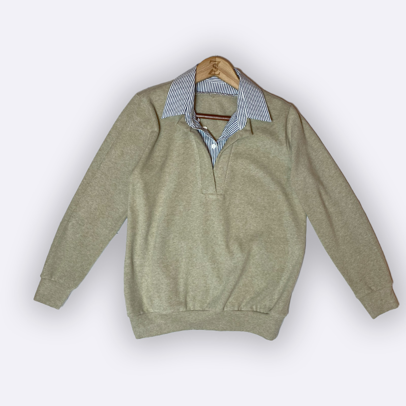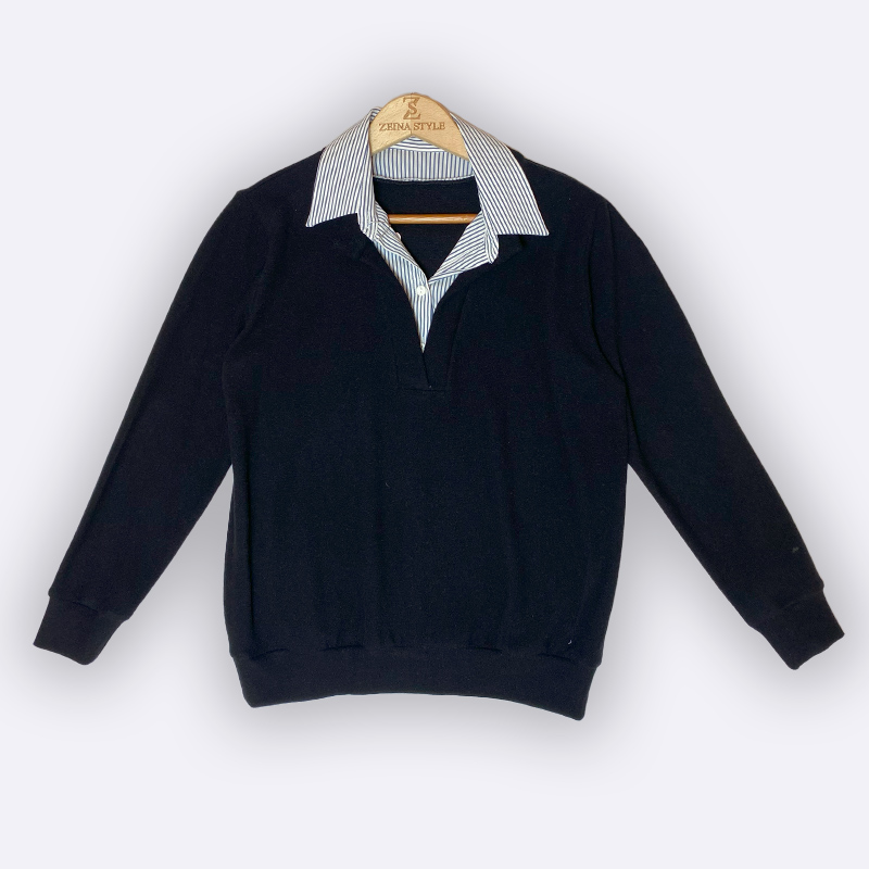 كنزة نسائية دافئة ومريحة بتصميم طبقتين، تتميز برقبة قميص كلاسيكية بنمط مقلم (أبيض وأزرق داكن) وياقة مفتوحة صغيرة، مع حواف مضلعة عند الخصر والأكمام لمظهر أنيق وعصري.