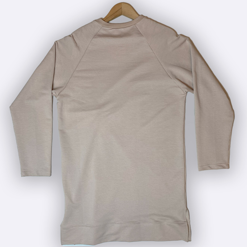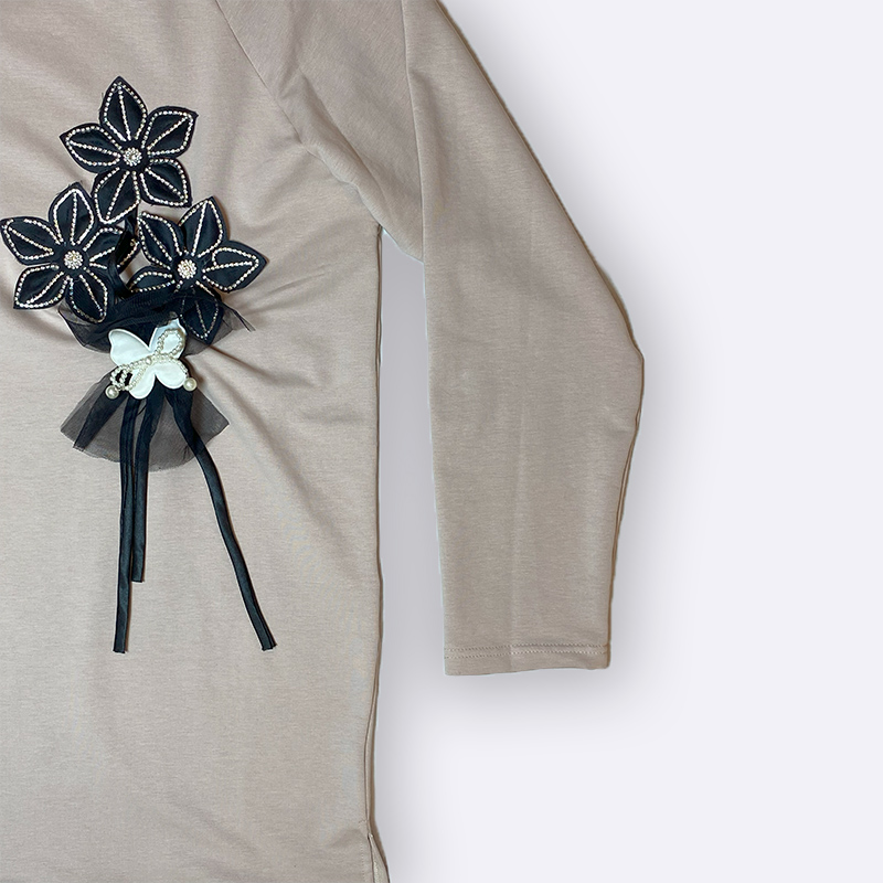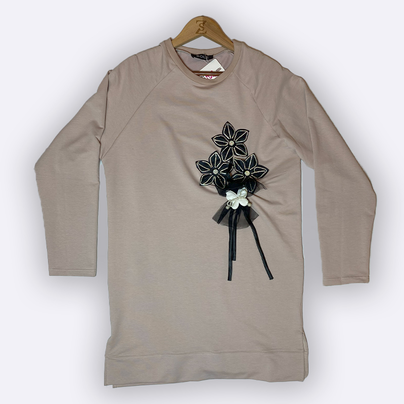 طقم نسائي مكون من قطعتين (بلوزة طويلة وبنطلون) بتصميم مريح ودافئ. تتميز البلوزة برقبة دائرية وتطريز زهري بارز ثلاثي الأبعاد مع لمسات من الخرز والشرائط الشبكية، مثالي للمنزل أو الإطلالات الكاجوال المريحة.