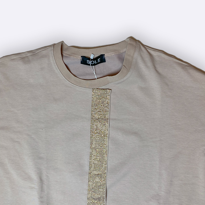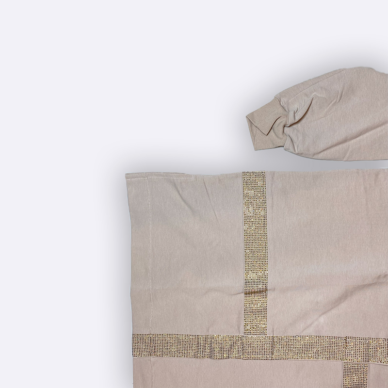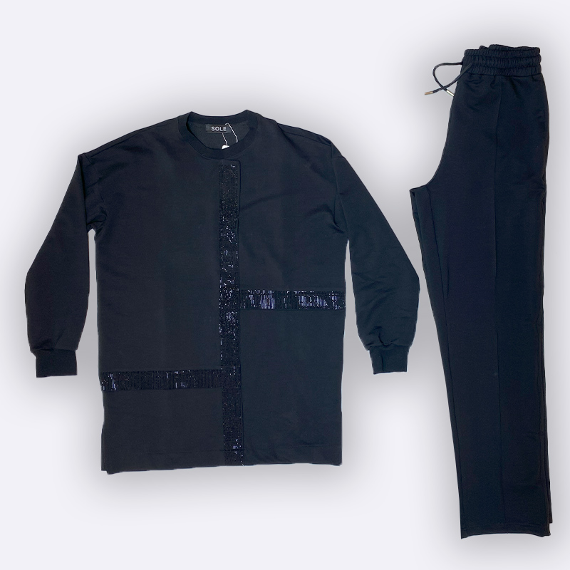 طقم بيجامة نسائي فاخر مكون من بلوزة طويلة وبنطلون مريح، يتميز بتفاصيل لامعة من الترتر على الصدر لإطلالة عصرية ومريحة في المنزل.