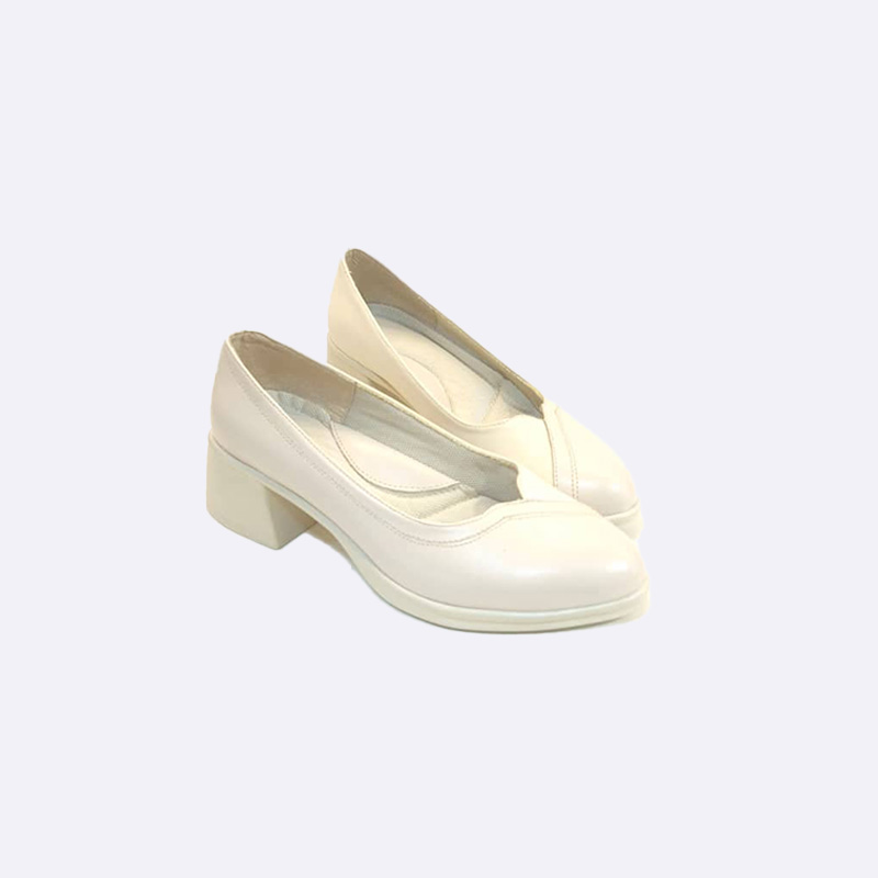 حذاء نسائي باللون البيج الفاتح، يتميز بتصميم كلاسيكي ومقدمة مستديرة، وكعب عريض ومنخفض ونعل طبي مريح، يمنحك راحة وثباتًا طوال اليوم