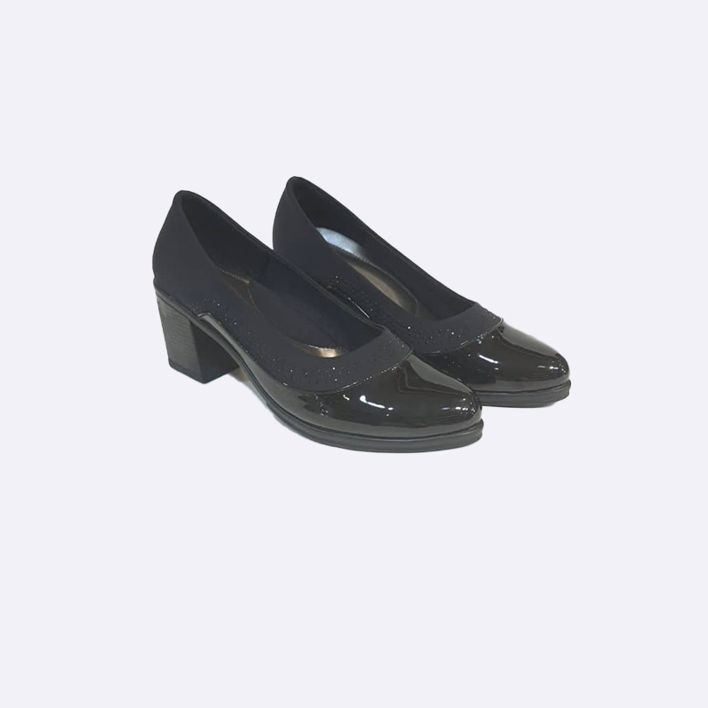 حذاء نسائي باللون الأسود اللامع، يتميز بتصميم أنيق ومقدمة مدببة، وكعب عريض ونعل طبي مريح، مناسب للاستخدام اليومي والعمل.