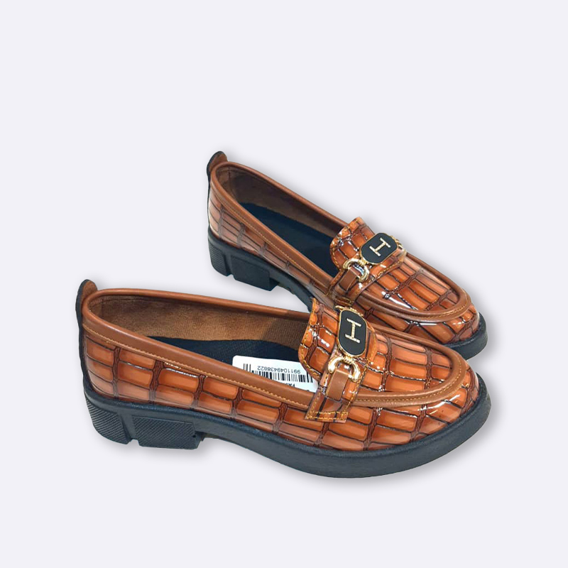 حذاء لوفر أنيق بنقشة التمساح بلون بني لامع، مزوّد بإبزيم معدني ذهبي يمنحك مظهراً راقياً. مناسب للاستخدام اليومي ومريح بفضل نعلته المتينة والعملية.