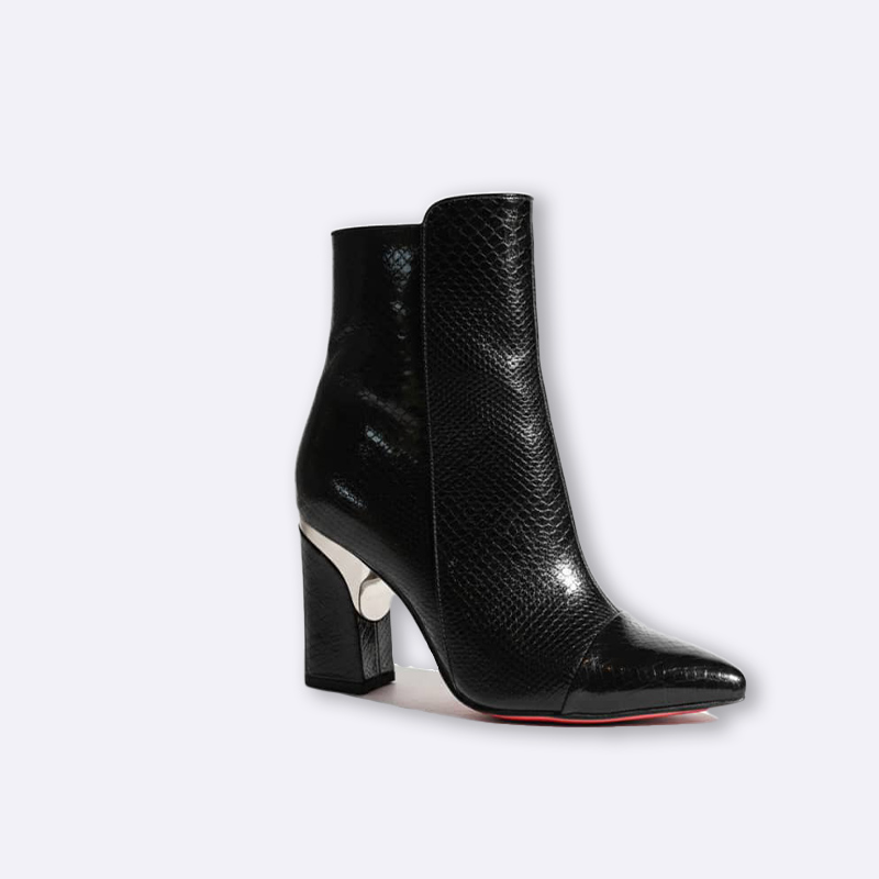 بوت نسائي أنيق مصنوع من جلد صناعي لامع بنقشة راقية، بتصميم يصل إلى الكاحل وكعب عريض يمنح ثباتاً وراحة أثناء المشي. يتميز بمقدمة مدببة وتفصيل معدني جذاب عند الكعب ليمنح إطلالة عصرية وفاخرة تناسب الإطلالات اليومية والمناسبات.