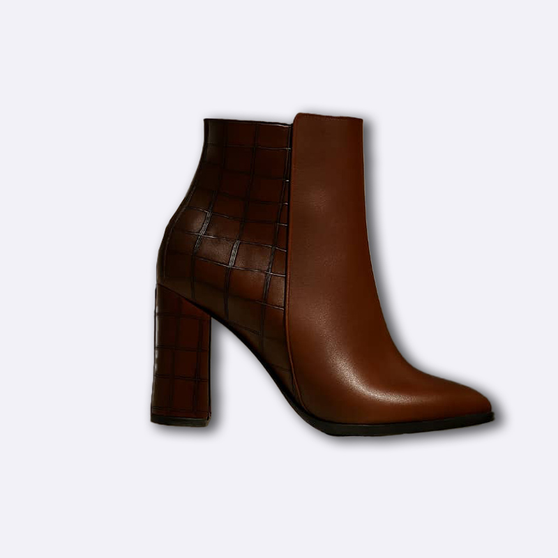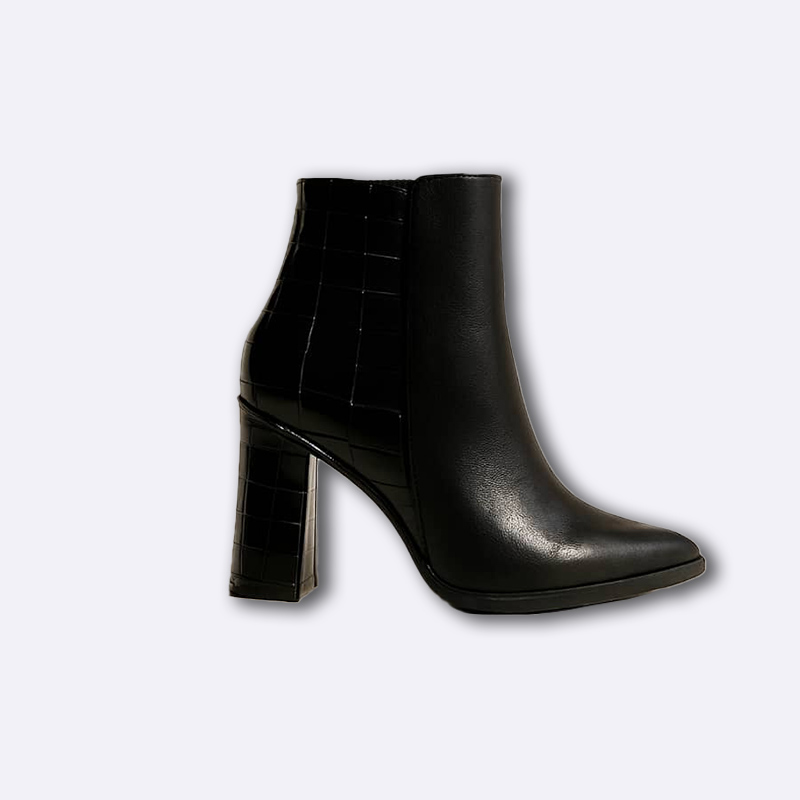 بوت نسائي أنيق مصنوع من جلد صناعي بنقشة جلد التمساح الراقية، بتصميم يصل للكاحل وكعب عريض يمنح ثباتاً وراحة أثناء المشي. يتميز بمقدمة مدببة وخامة لامعة تضفي لمسة فاخرة، مما يجعله مناسباً للإطلالات اليومية والمناسبات المسائية.