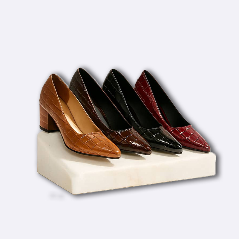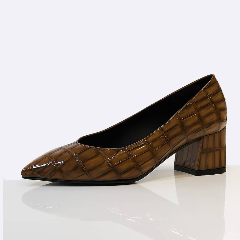 حذاء نسائي أنيق بتصميم كلاسيكي بنقشة جلد التمساح الراقية. يأتي بكعب عريض يوفر ثباتاً وراحة أثناء المشي، مع مقدمة مدببة تضيف لمسة فخامة وأناقة. مناسب للعمل، الإطلالات اليومية، والمناسبات الهادئة.