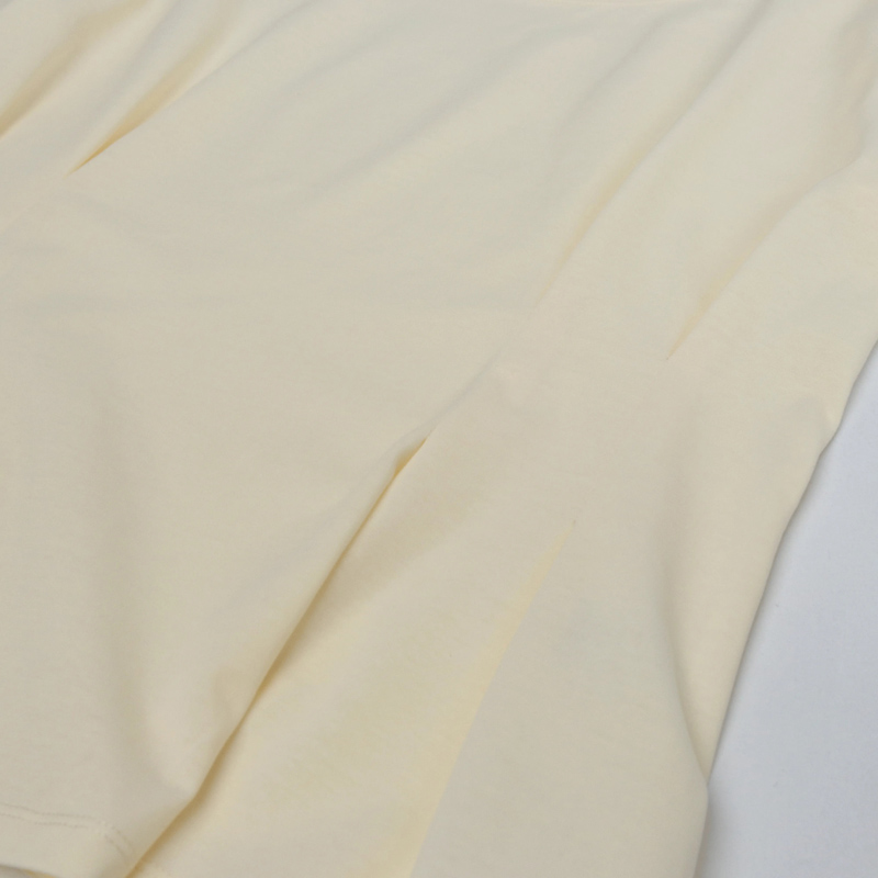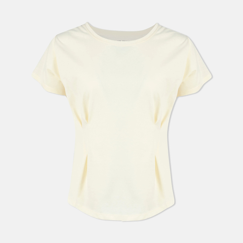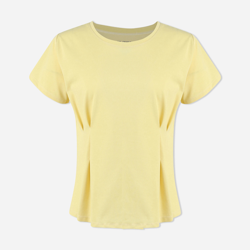 تيشيرت نسائي ناعم وأنيق بثنيات بألوان أنيقة: أبيض عاجي، أصفر فاتح، رمادي، وأرجواني. مصنوع من مزيج مسامي من 65% قطن و35% fty صناعية لراحة تدوم طوال اليوم ومقاس مثالي.
