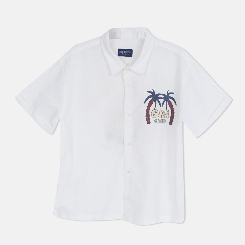 قميص أولادي بطبعة عصرية بألوان أبيض، بيج، وسماوي. مصنوع من مزيج الكتان 55% والقطن 45% لراحة وأناقة تدوم طوال اليوم.