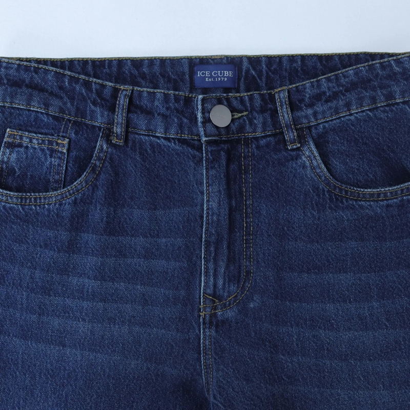 بنطال جينز رجالي كلاسيكي عصري من الدنيم الأزرق الغامق. مصنوع من قطن خالص (99%) مع إضافة 1% إيلاستين