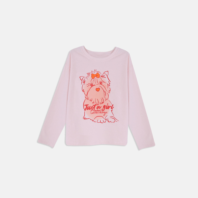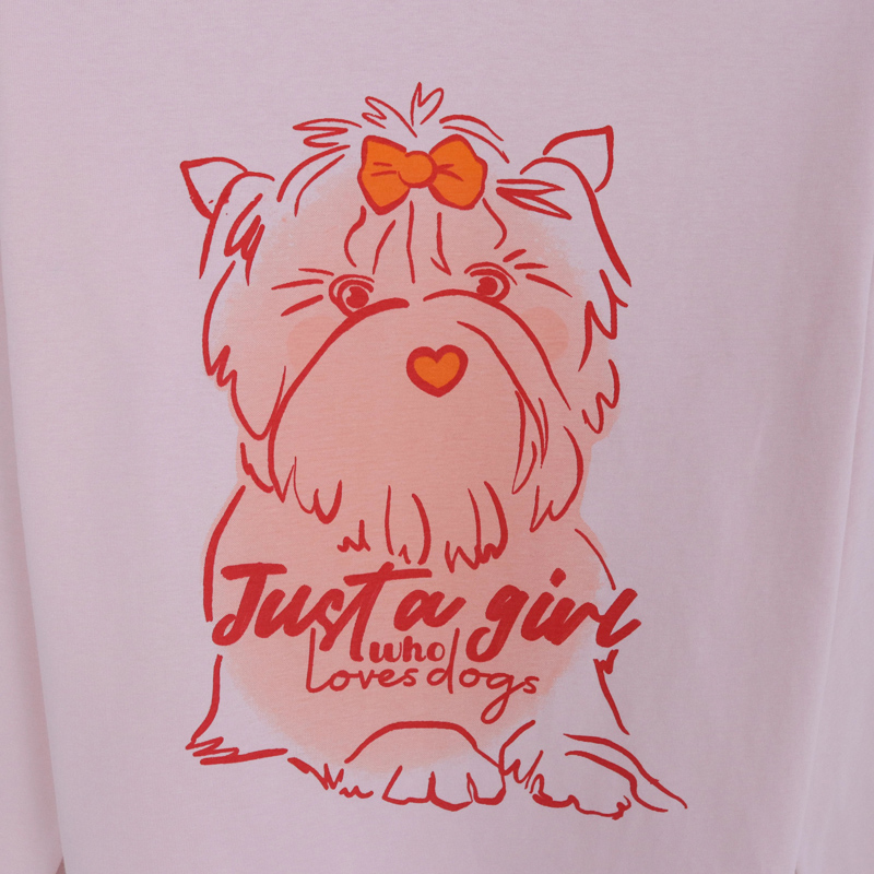 تي شيرت كاجوال مريح وأنيق مصنوع من القطن 100% فائق النعومة. يتميز بطباعة جرافيكية عصرية للكلاب، وأكمام طويلة مثالية للطقس المعتدل. متوفر بلونين جميلين: الزهر الغامق والزهر الفاتح.