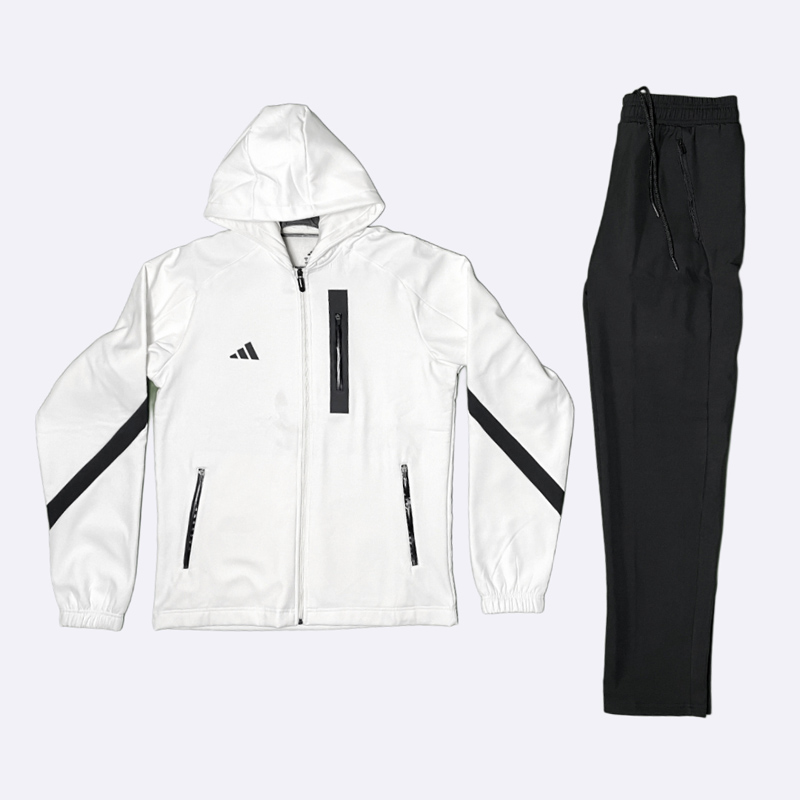 ة رياضية رجالية متكاملة من قطعتين، تتميز بجاكيت بسحاب كامل بغطاء رأس وجيوب بسحّابات، وبنطلون رياضي بخصر مطاطي وجيوب بسحّابات، مع شعار أديداس على كلتا القطعتين وتفاصيل على الأكمام والأرجل.