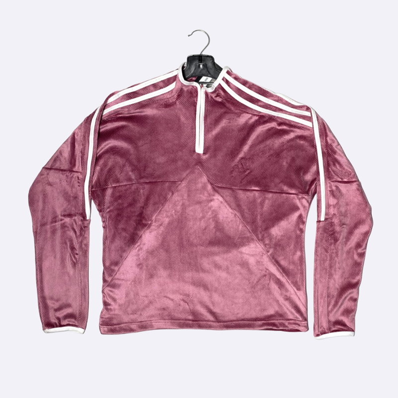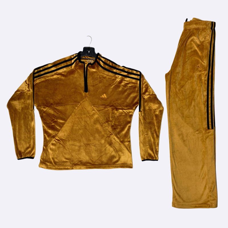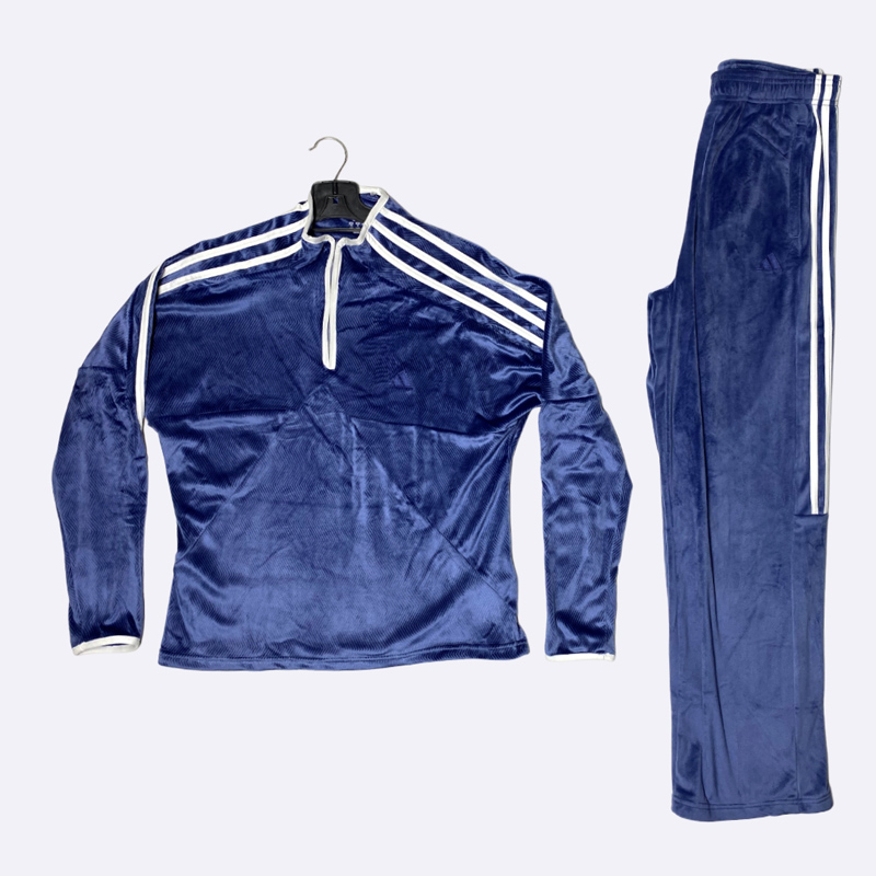 طقم بدلة رياضية نسائية بلمسة فاخرة، مصنوع من قماش المخمل الناعم (Velour). يتكون من سويت شيرت بسحاب ربعي (Quarter-Zip) وخطوط أديداس الثلاثة على الأكمام، وبنطلون رياضي واسع بخصر مطاطي والخطوط الثلاثة على الجوانب.