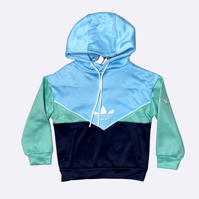 طقم رياضي للأولاد بتصميم كتل الألوان (Color Block) مميز بدرجات الأزرق والأخضر، يتميز بجاكيت بغطاء رأس (هودي) وشعار تريفويل (شعار أوريجينالز).