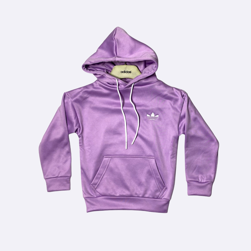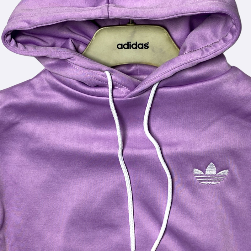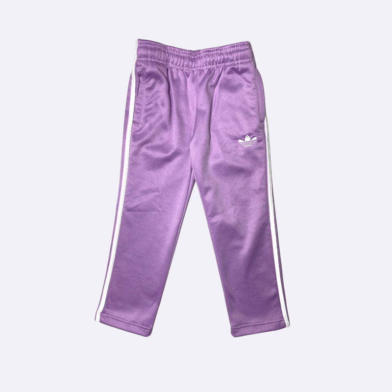 طقم رياضي للبنات باللون البنفسجي الفاتح، يتميز بخامة لامعة (ساتان) وبنطلون بثلاثة خطوط جانبية بيضاء، يحمل شعار تريفويل (شعار أوريجينالز).