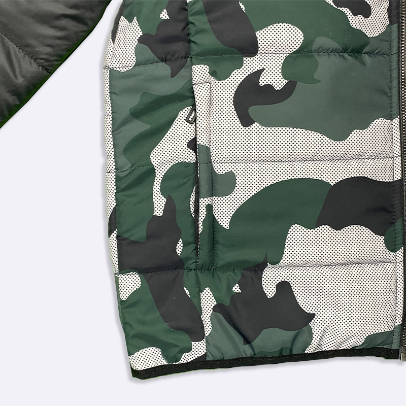 جاكيت مبطن بقلنسوة يتميز بتصميم يجمع بين نمط التمويه والجزء العلوي السادة مع شعار العلامة التجارية.
