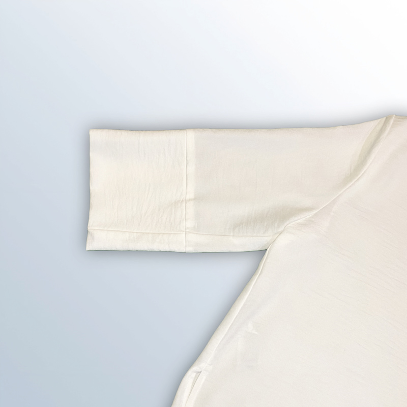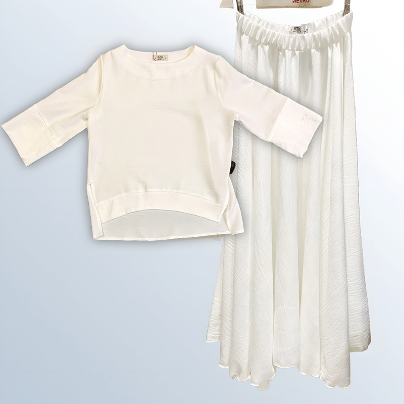 طقم نسائي مكون من قطعتين: بلوزة وتنورة من قماش اللنن بنسبة 65% قطن. متوفر بألوان الأورانج، البيج والأبيض.