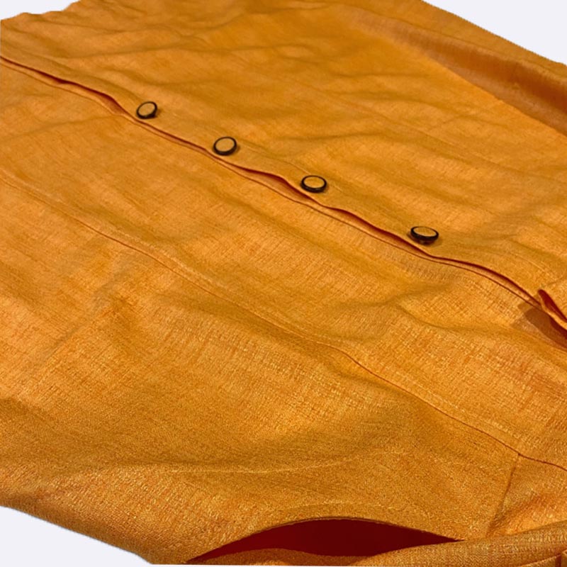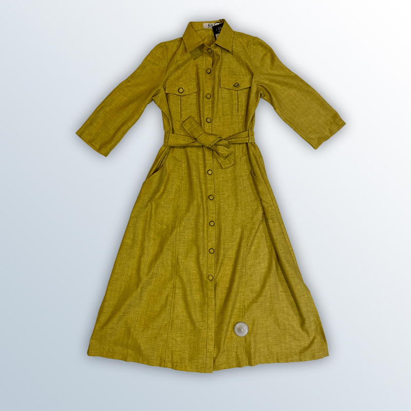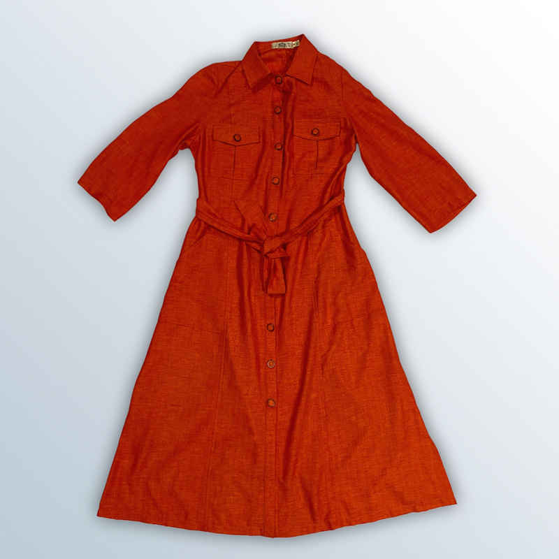 فستان نسائي طويل على شكل قميص، بأكمام ثلاثة أرباع، وحزام عند الخصر. مصنوع من القطن بنسبة 65%، ومتوفر بألوان: الموتارد، الأورانج الغامق، والأورانج الفاتح.