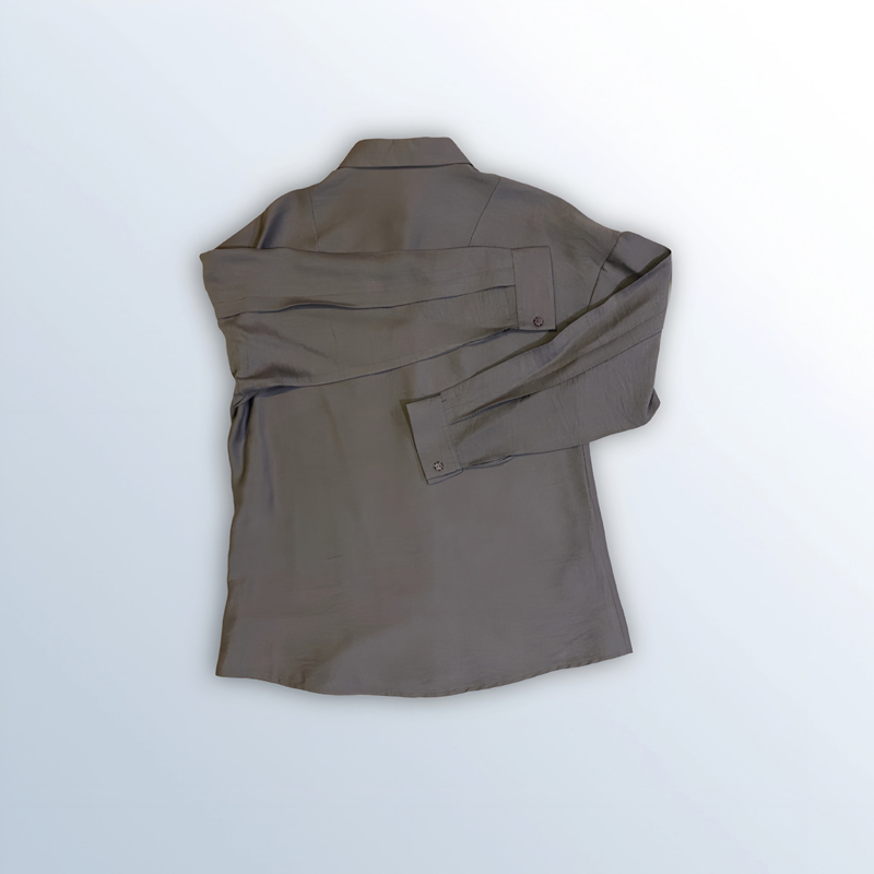 قميص نسائي سادة بأكمام طويلة وتفاصيل خياطة بسيطة، مصنوع من القطن بنسبة 65%. متوفر بألوان: الرمادي والتركواز.