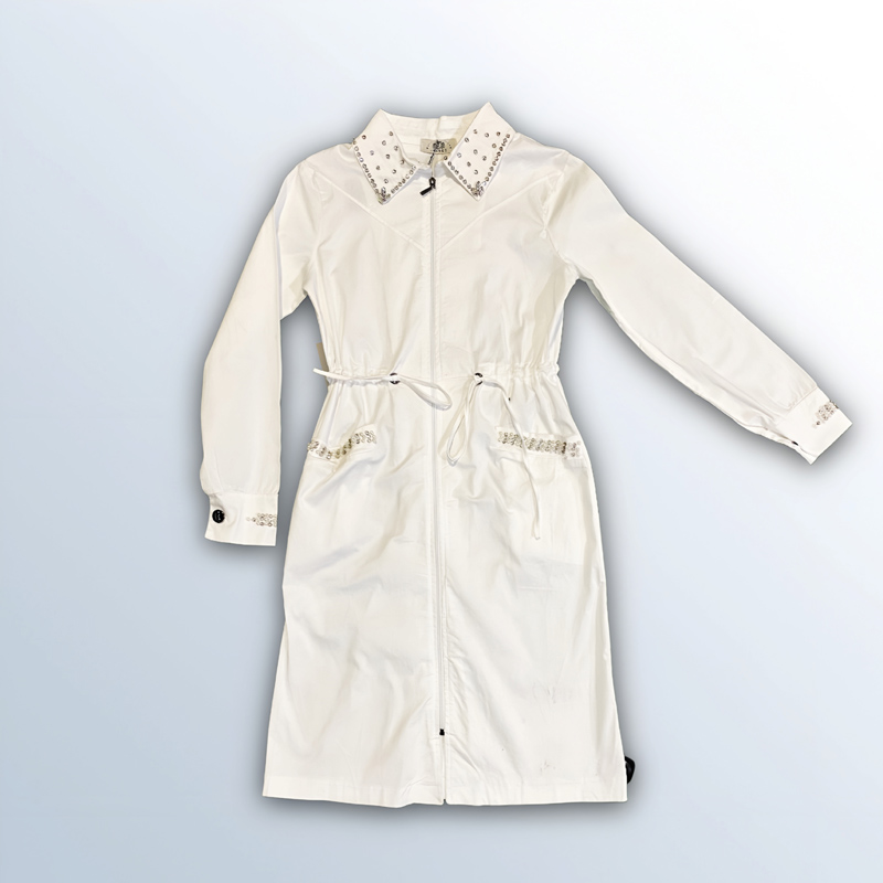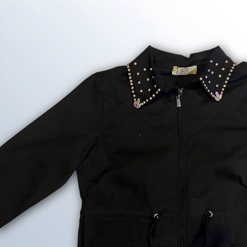 معطف نسائي طويل باللون الأسود، مزين بالكريستال على الياقة، الجيوب، والأكمام. يحتوي على سحاب للإغلاق. مصنوع من القطن بنسبة 98%، ومتوفر باللونين الأسود والأبيض.
