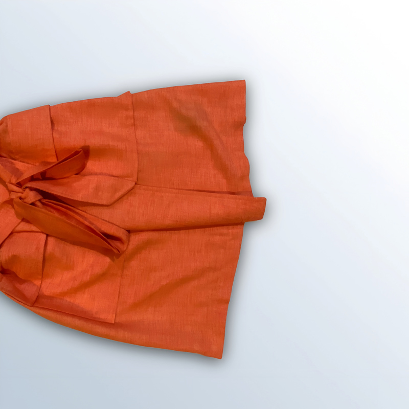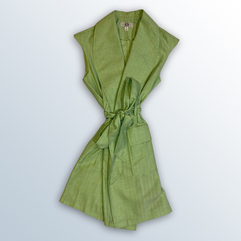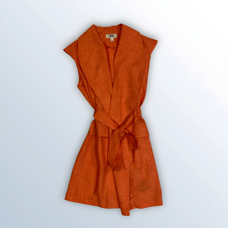 فيست نسائي بياقة عريضة وحزام حول الخصر، مصنوع من القطن بنسبة 65%. متوفر بألوان: البيج الفاتح، الكيوي، والأورانج.