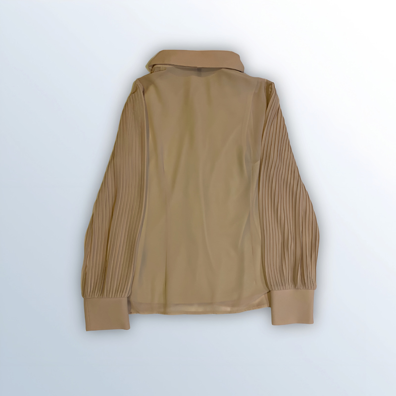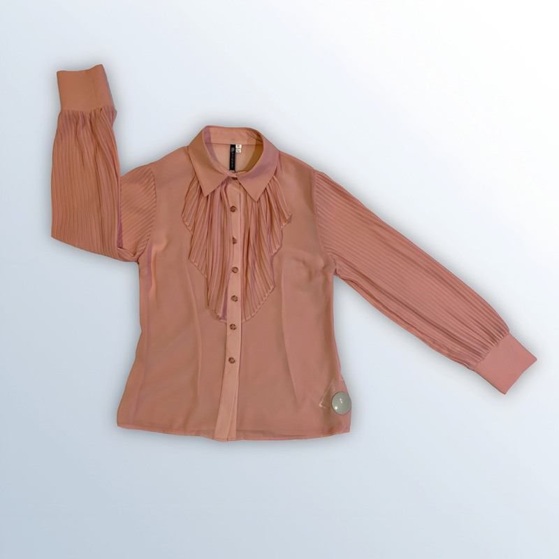 قميص نسائي بأكمام طويلة مصنوع من قماش الشيفون البوليستر بنسبة 100%. يأتي مع بروتيلة داخلية، ومزين بتفاصيل كشكشة عمودية على الصدر والأكمام. متوفر بألوان: البيج، الأبيض، الأسود، والزهري.