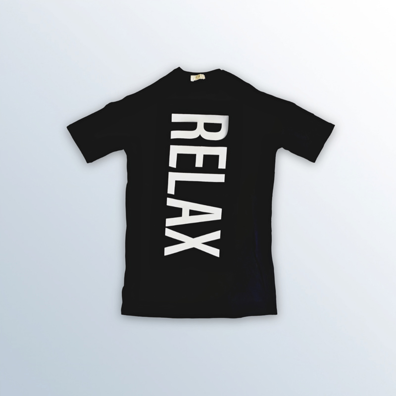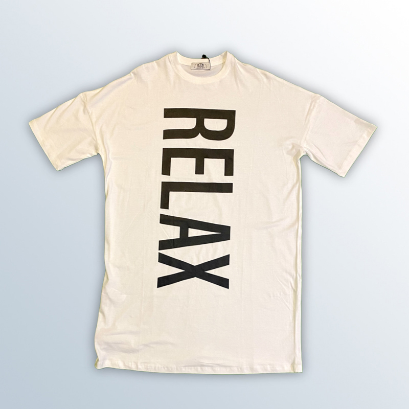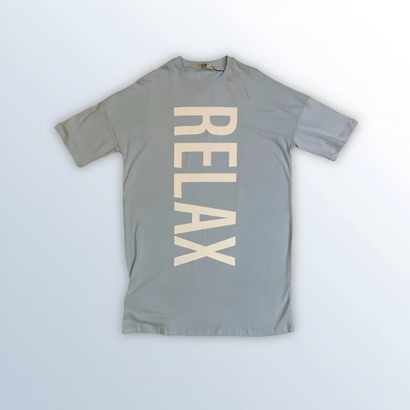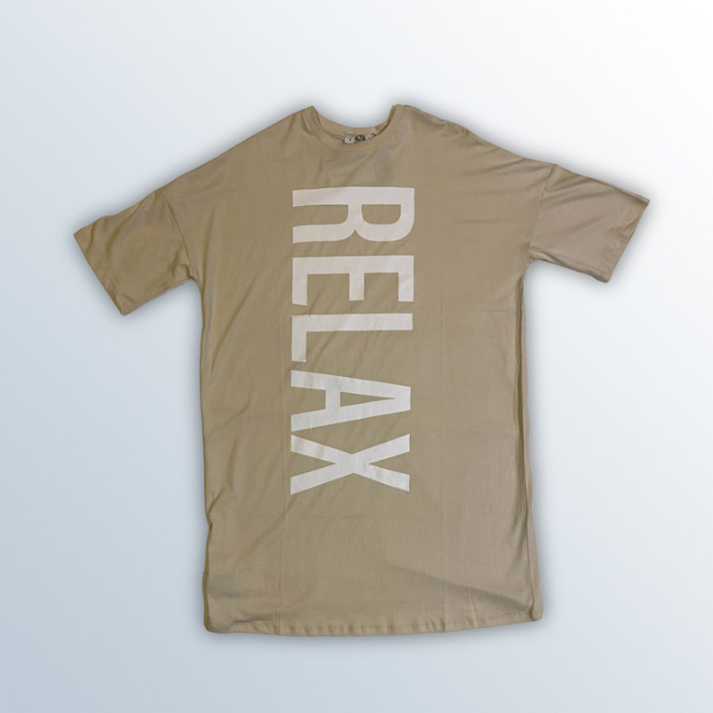 ميص نسائي طويل وفضفاض بطبعة "RELAX" عمودية، مصنوع من القطن بنسبة 98%. متوفر بألوان: الأبيض، الأسود، السماوي، والبيج.
