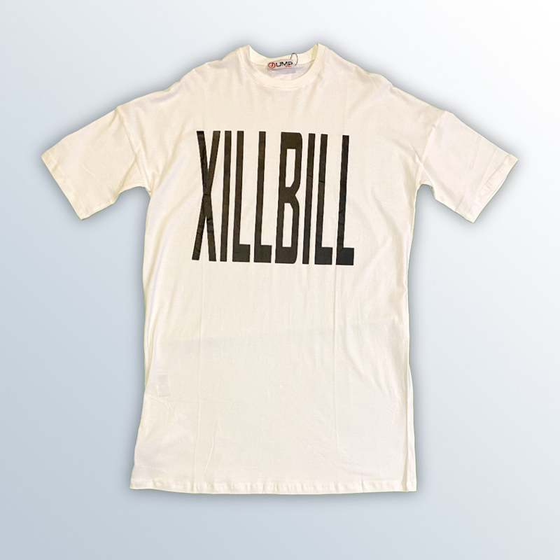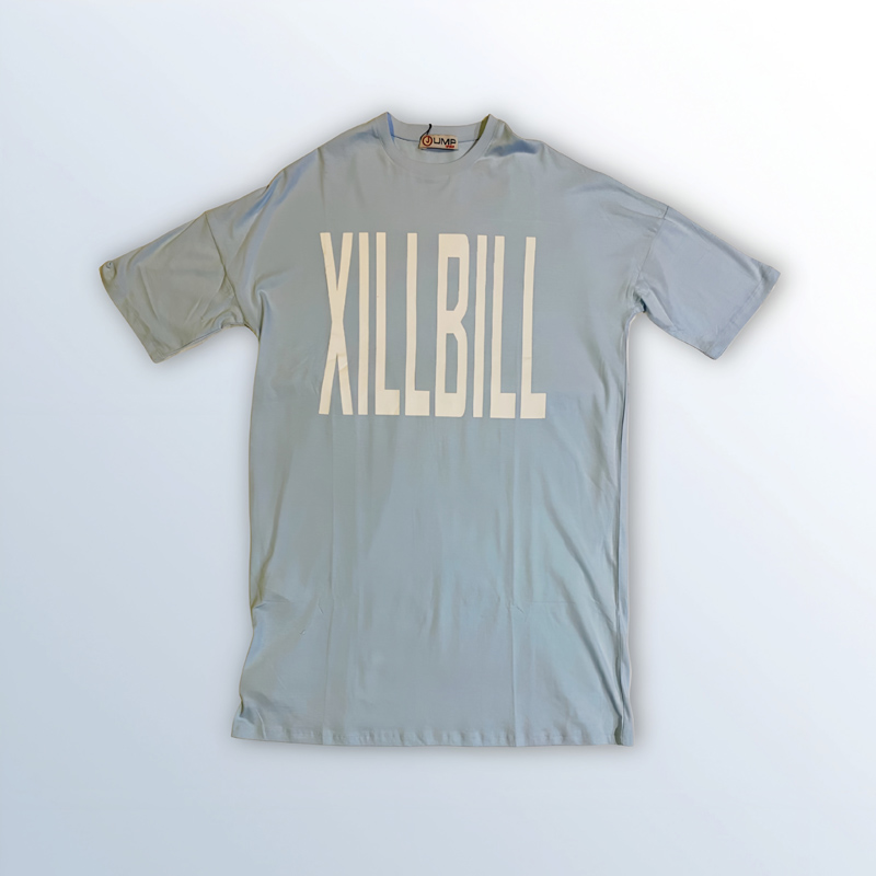 ميص نسائي طويل وفضفاض بطبعة "XILLBILL" افقية، مصنوع من القطن بنسبة 98%. متوفر بألوان: الأبيض، الأسود، السماوي.