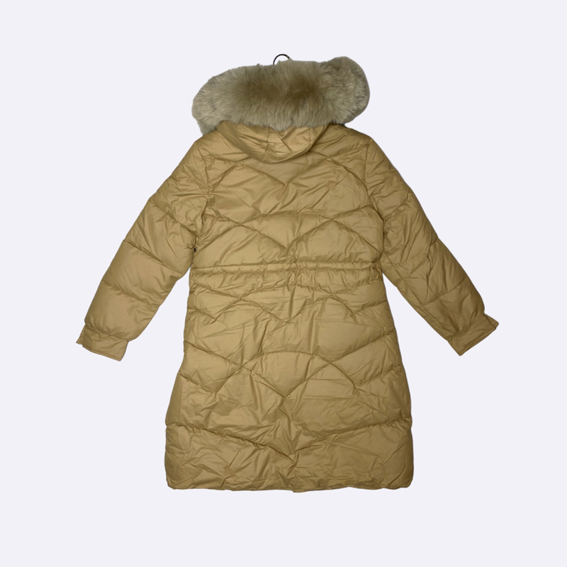 جاكيت باركا نسائي مبطن متوسط الطول، يتميز بغطاء للرأس مزين بفرو صناعي وجيوب برباط سحب عند الخصر.